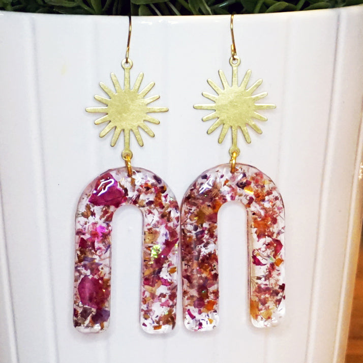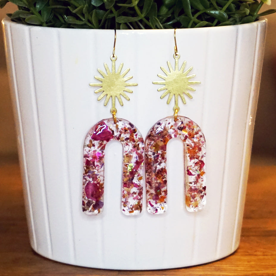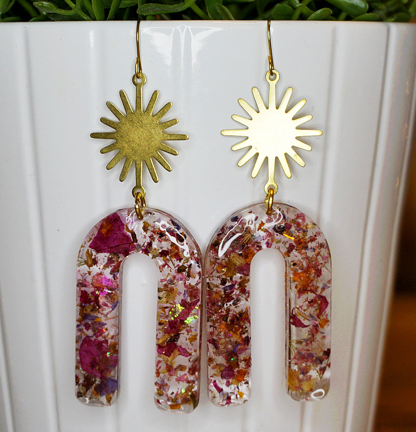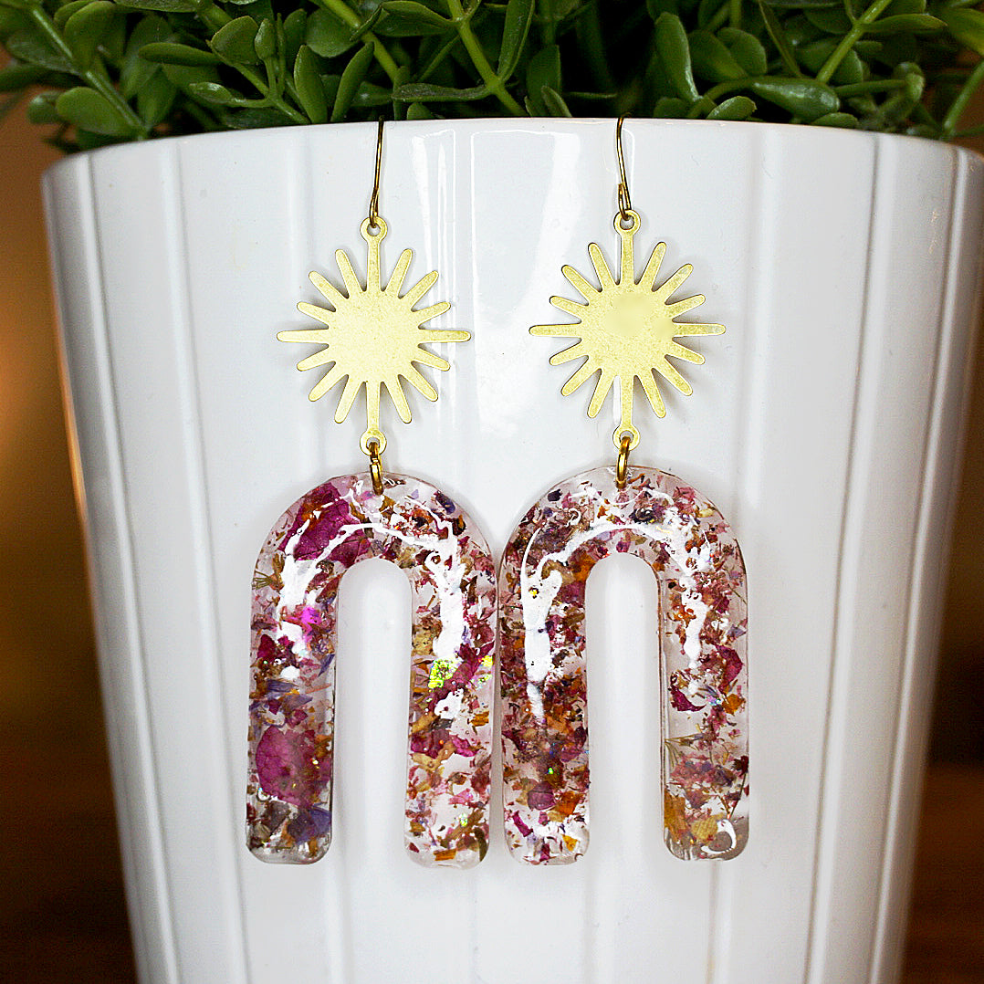 Handmade earrings | Stunning Art Deco-inspired dangles with glowing golden suns and dried floral confetti infused in eco-resin.