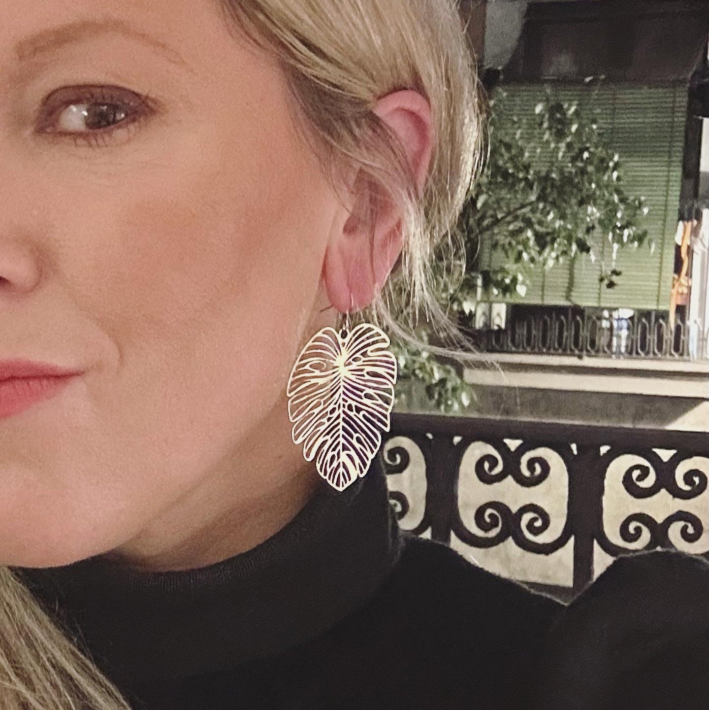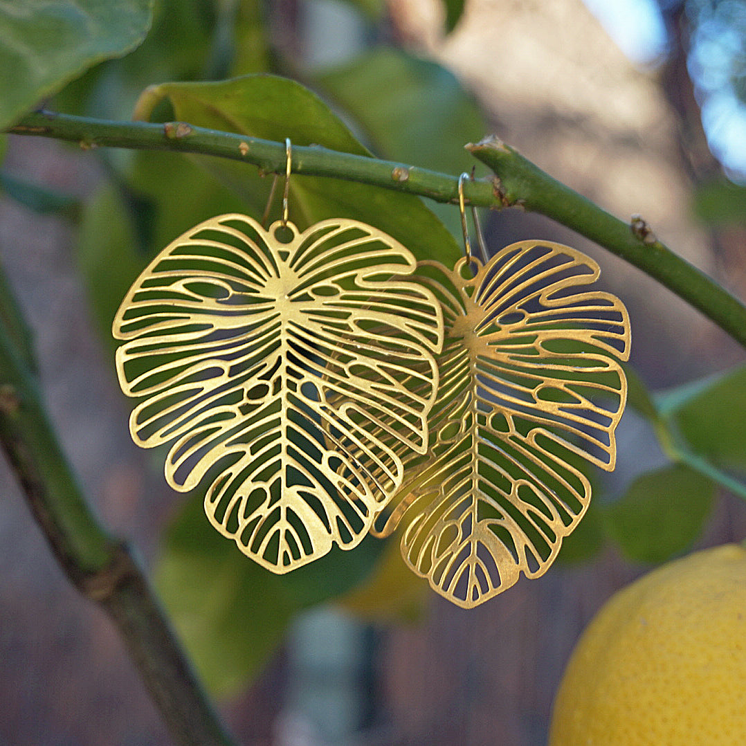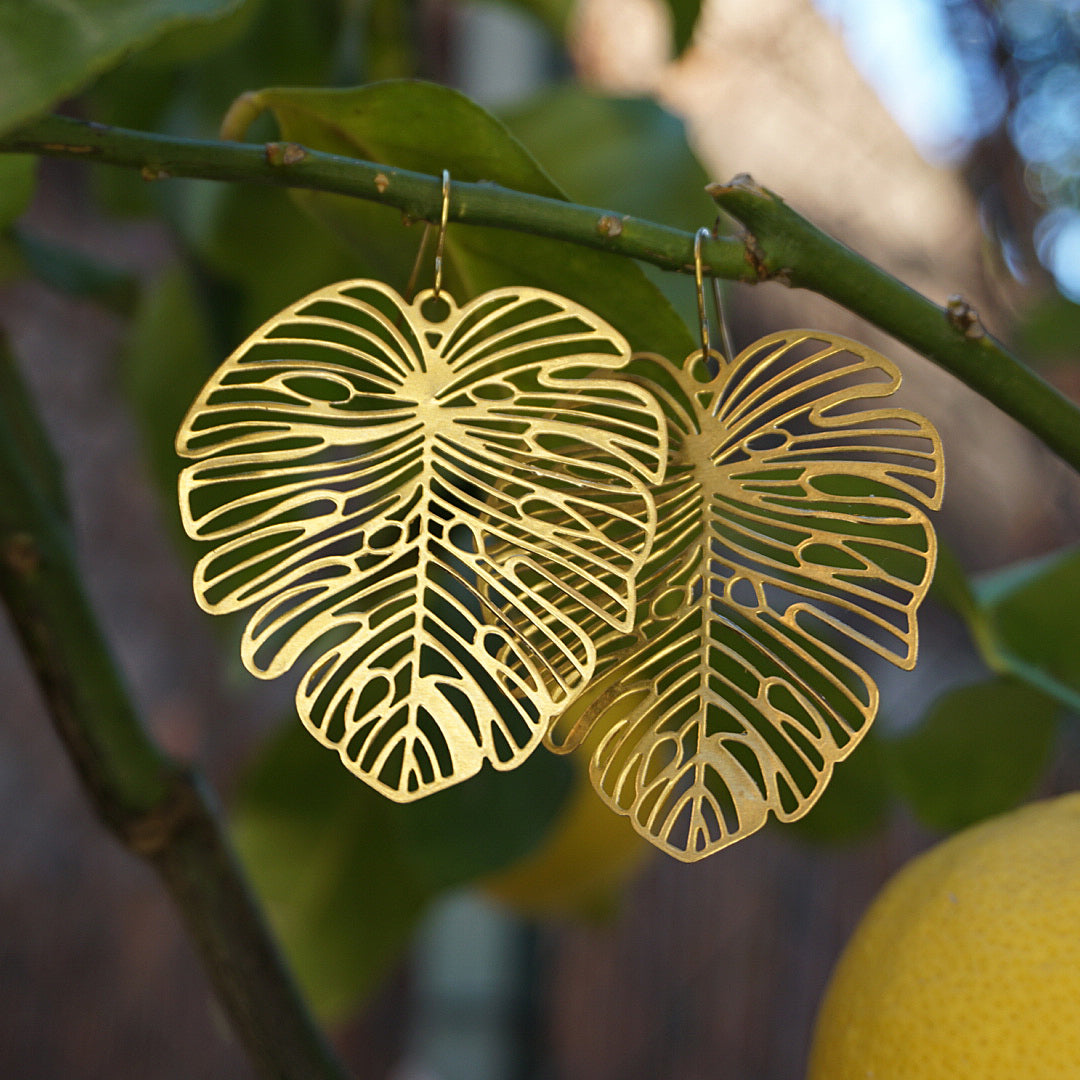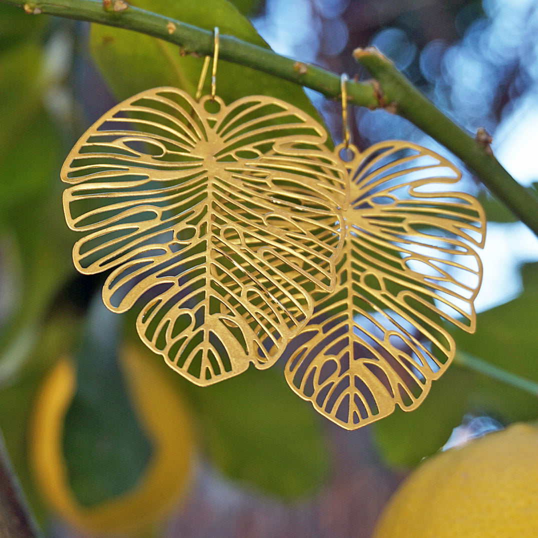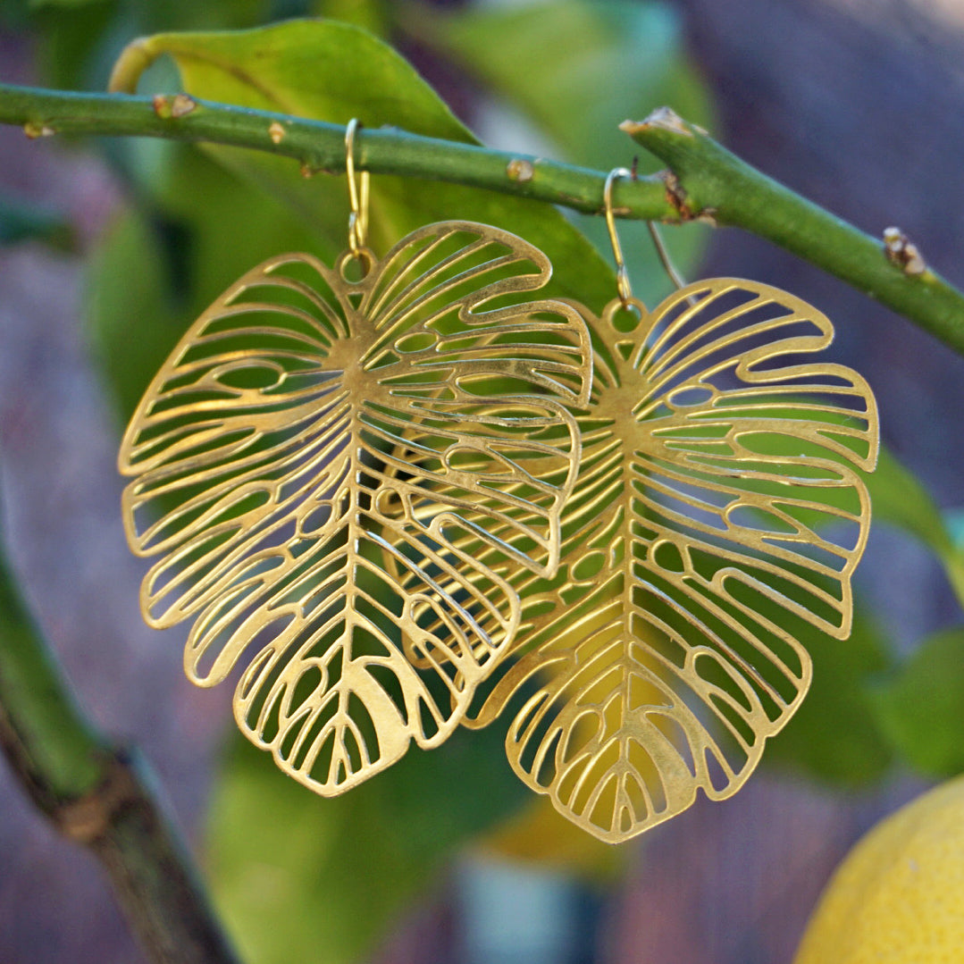 Handmade earrings | Intricate and delicate, super lightweight golden monstera leaf earrings that beautifully reflect light. Perfect for adding elegant sophistication to a day, dusk or evening outfit.