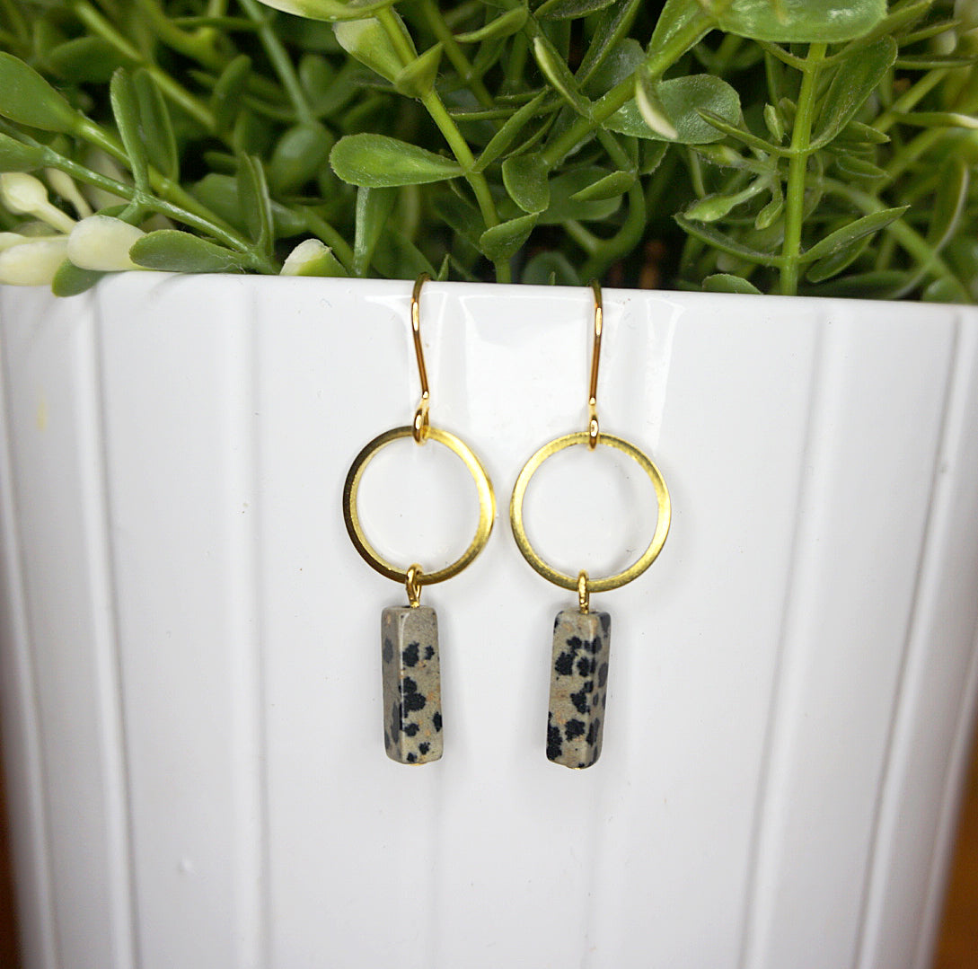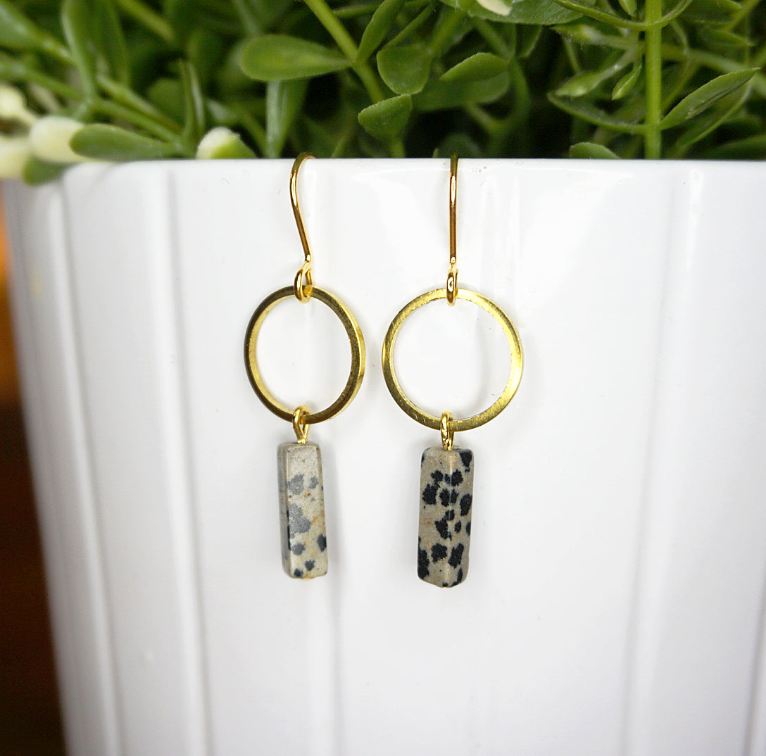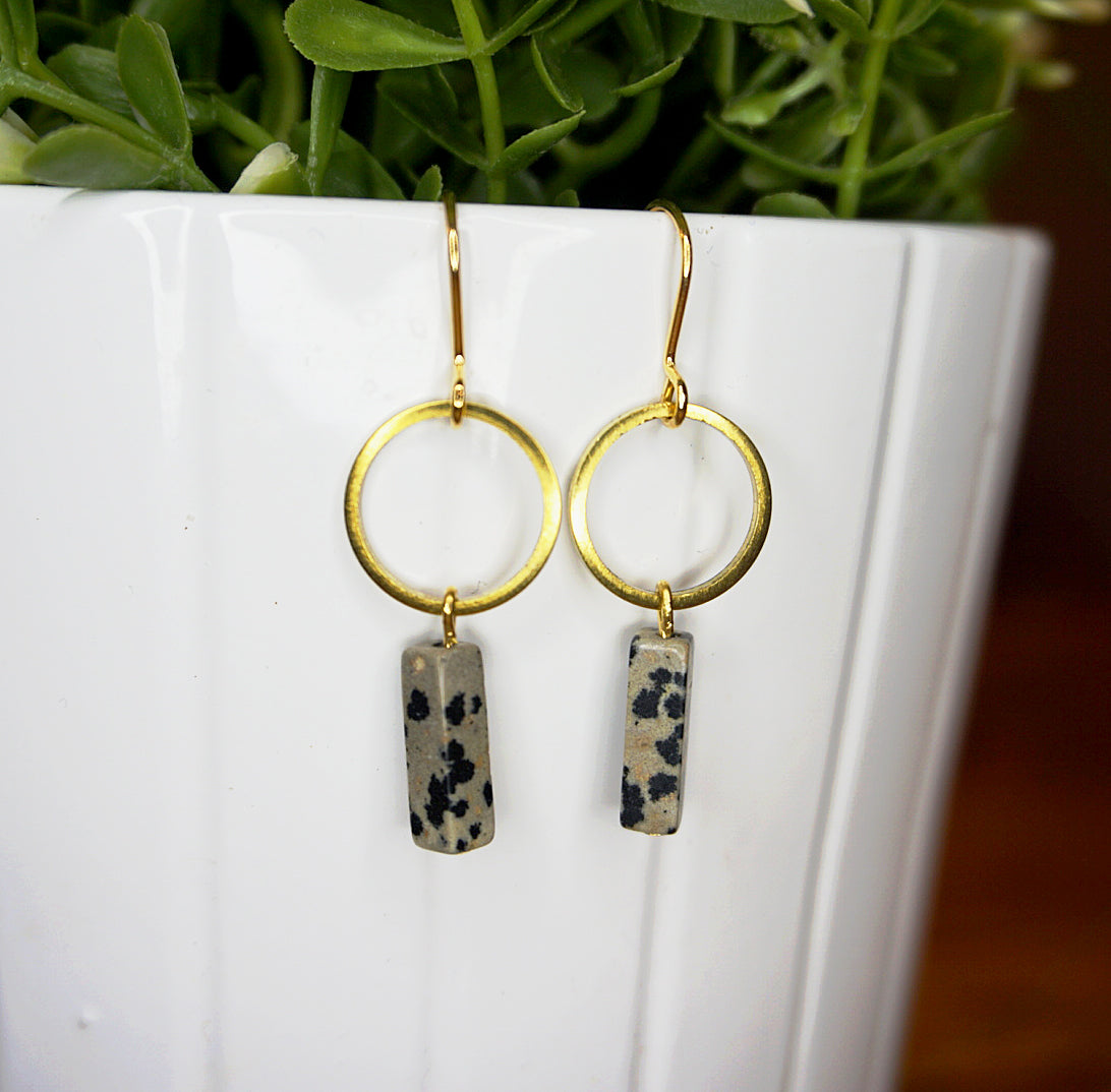 Handmade earrings | A unique mineral-based jasper bead is fixed to a gold-plated disc, perfect for elegant daytime way, carrying you through dusk and to dancing and beyond.