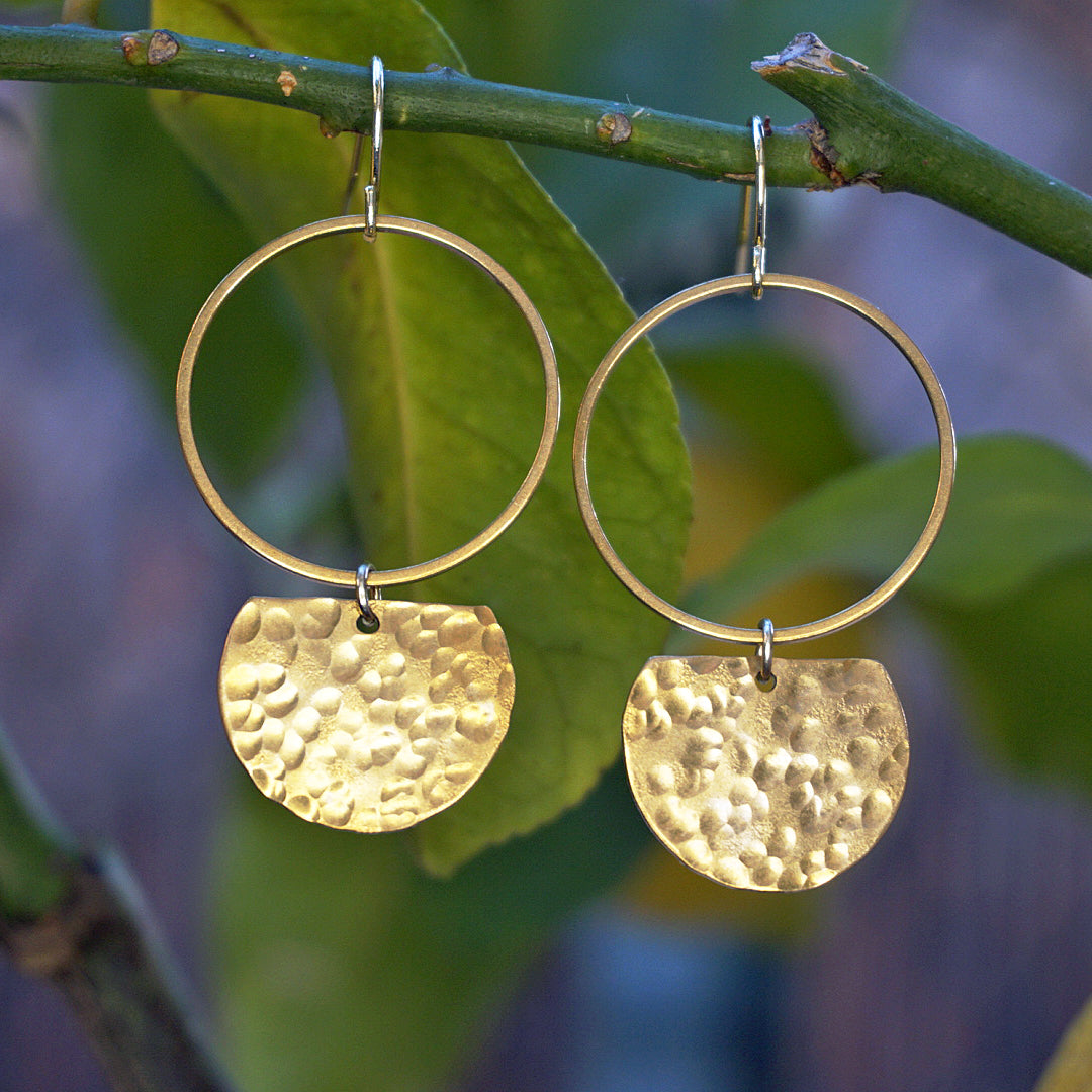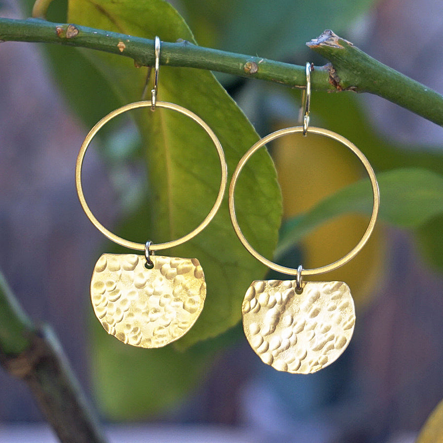 Handmade earrings | Super lightweight, a delicate hammered coin is set below a golden hoop, just perfect for adding uber golden sophistication to any daytime through to evening outfit.