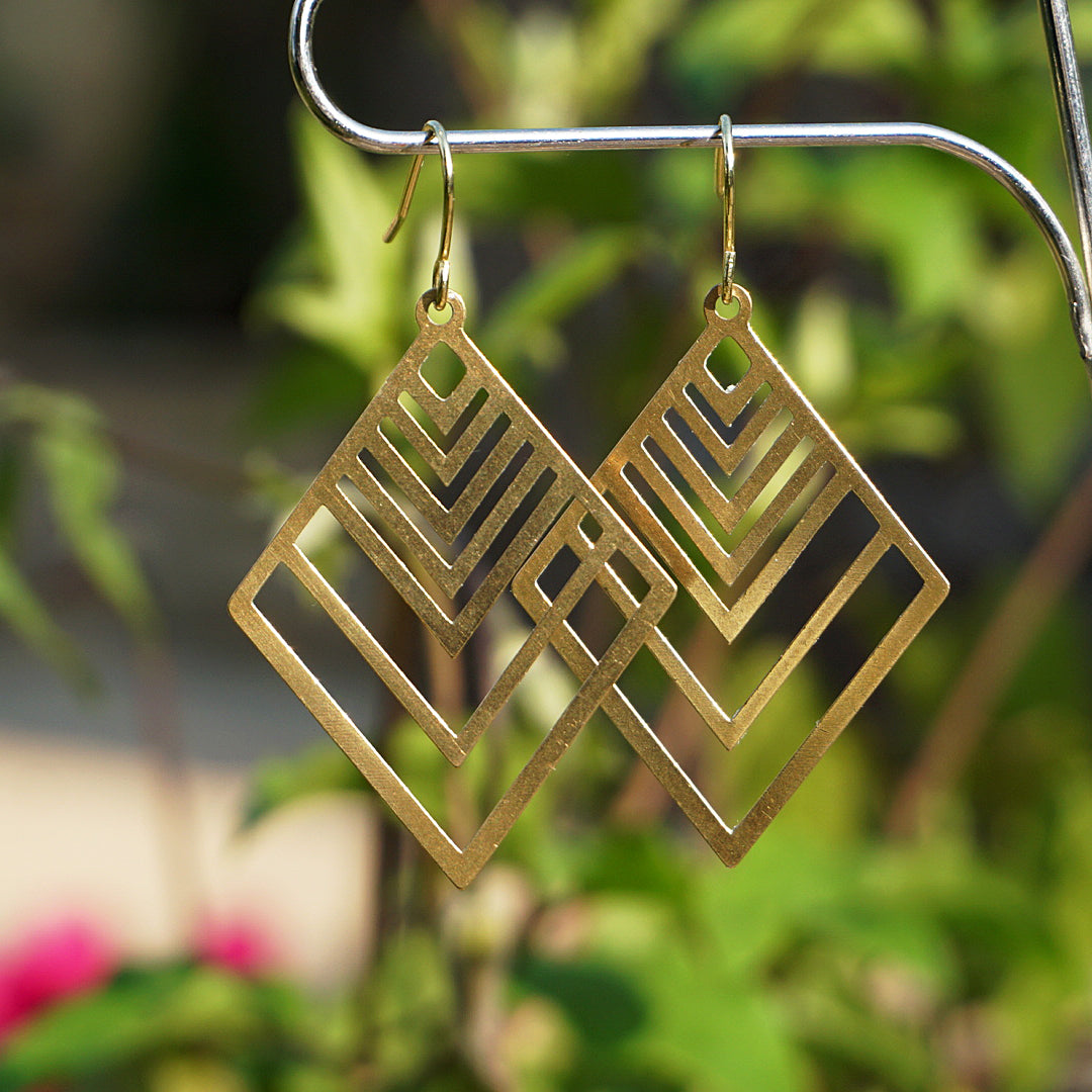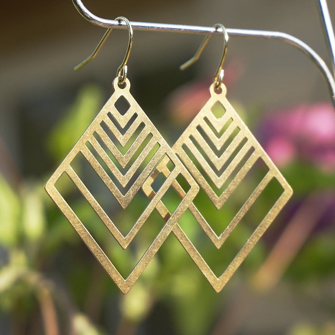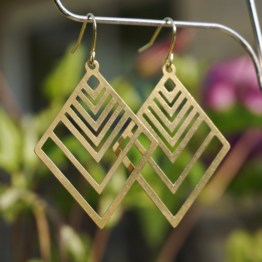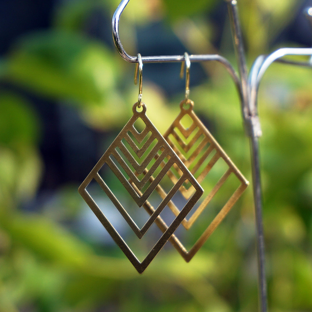 Handmade earrings | Layered golden brass diamond shapes, perfect for chic elegant daytime style, the office, through to a more glamourous evening ensemble.