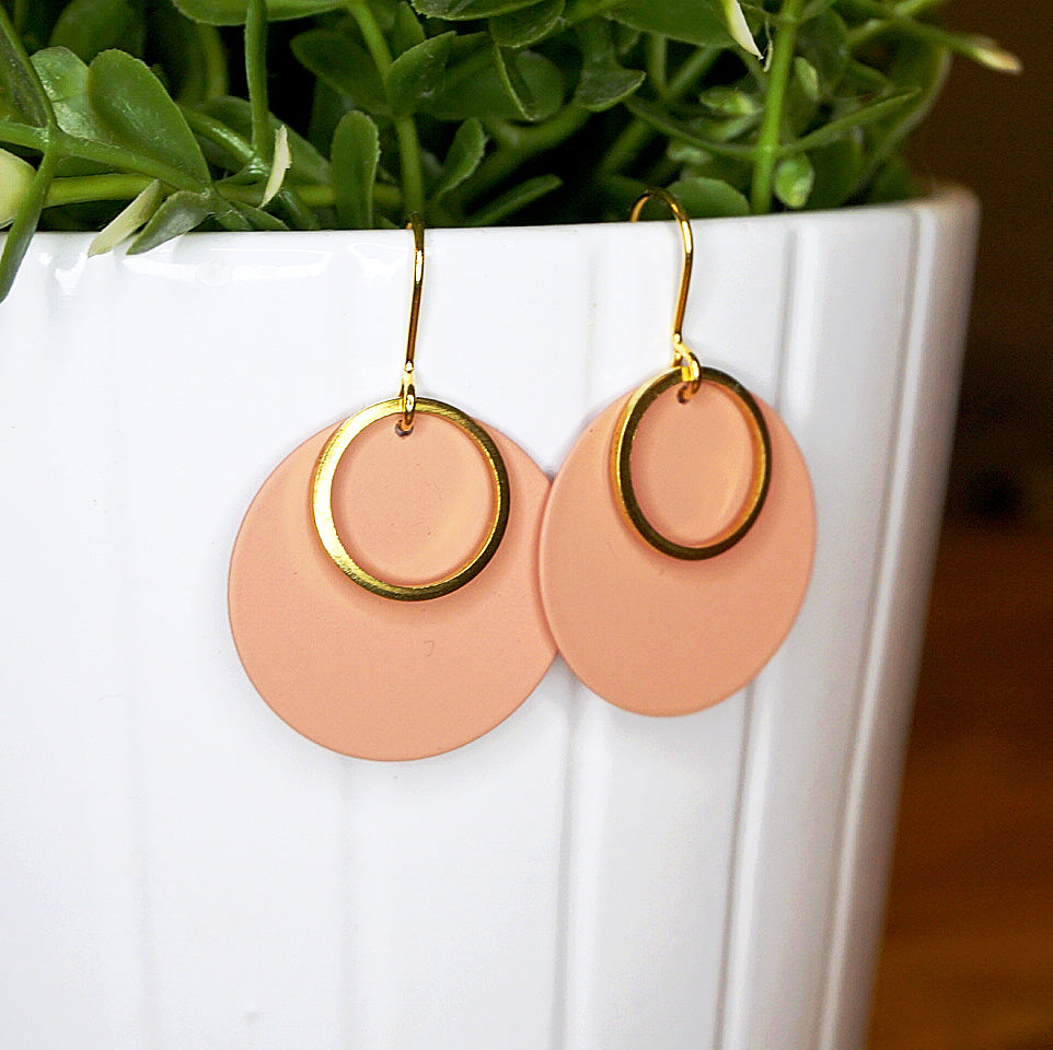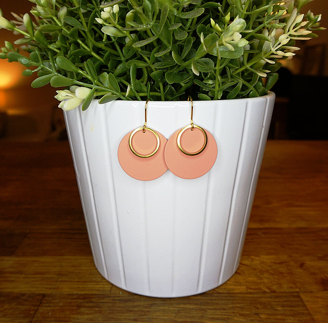 Handmade earrings | Simple yet striking - a bold, colourful disc (powder coated) set with reflective brass hoops to complement each other and create a beautiful geometric piece. Perfect for daytime confidence, dinner or to dress-up for a fiesta and dance through the night.