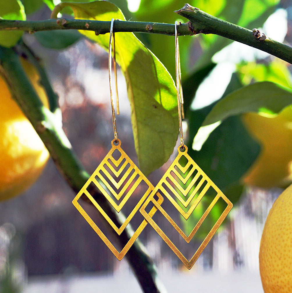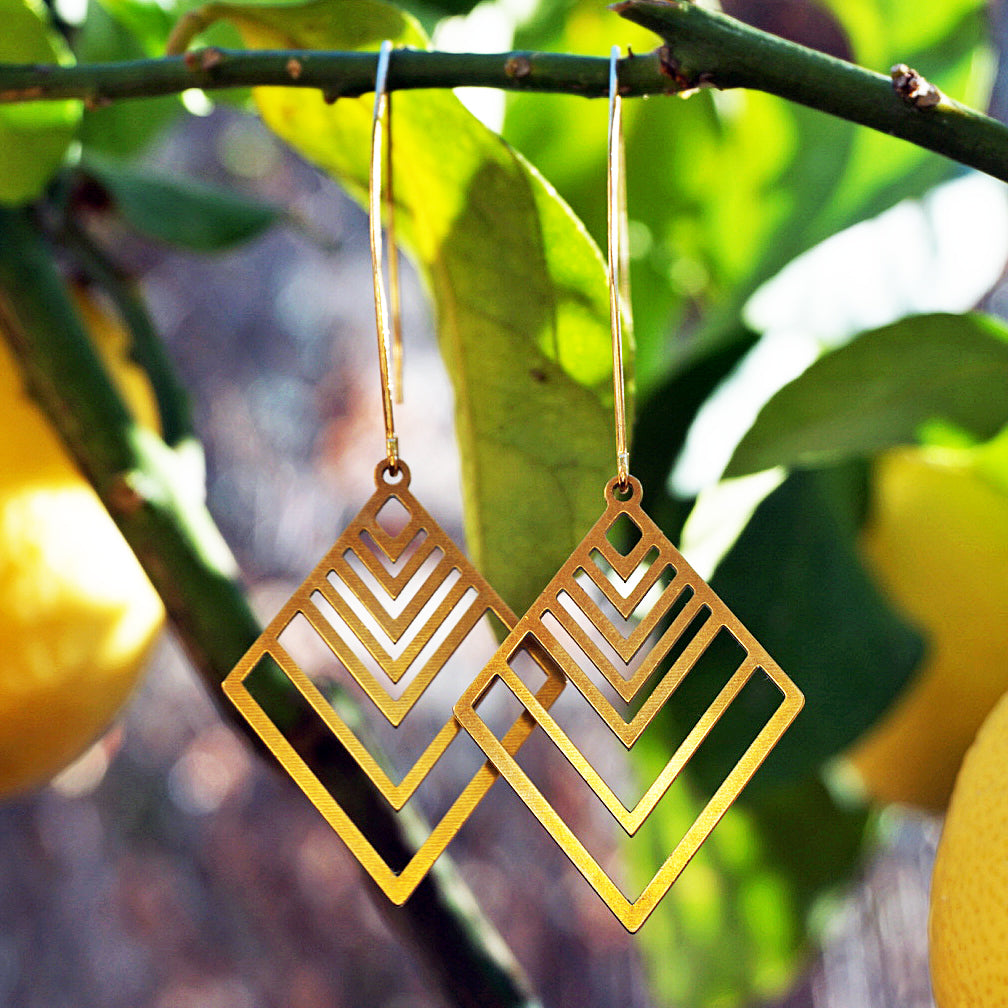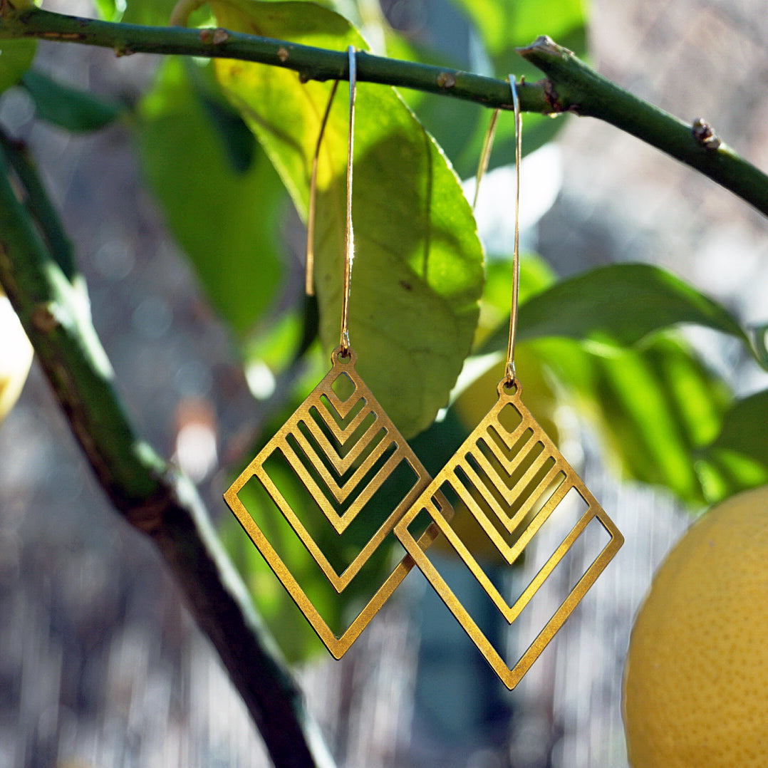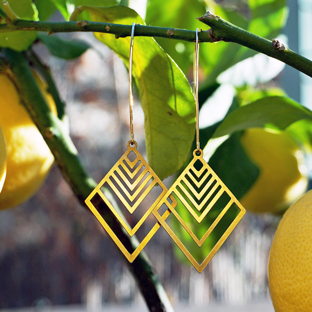 Handmade earrings | Layered lightweight brass diamond shapes on a long drop hook, perfect for chic elegant daytime style or adding pure glamour to an evening ensemble.