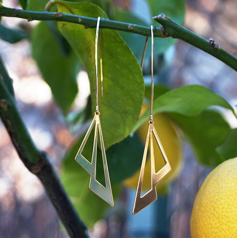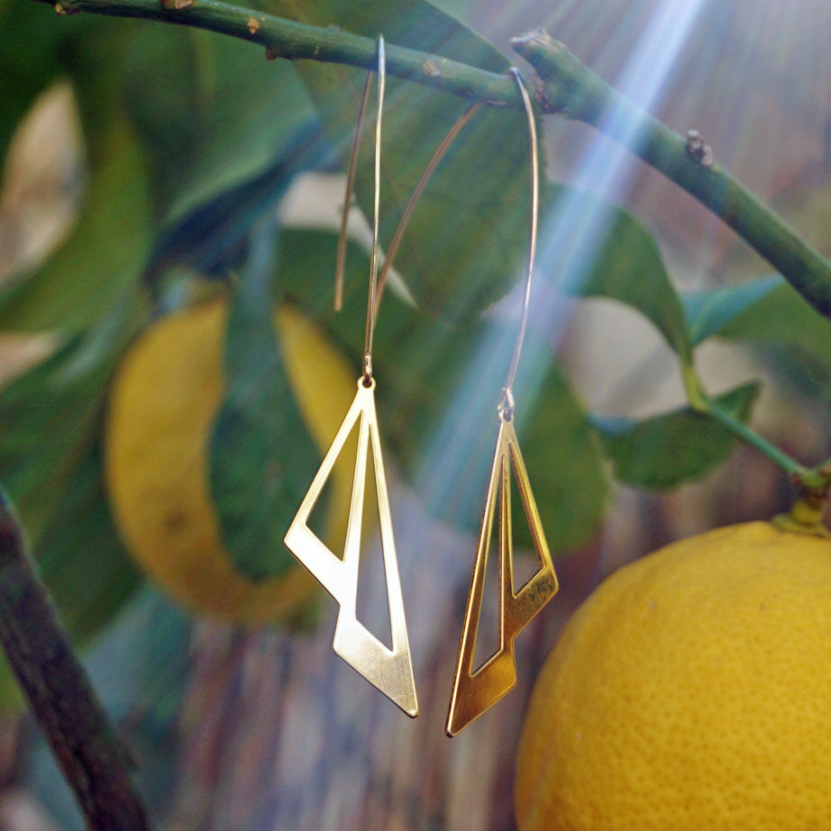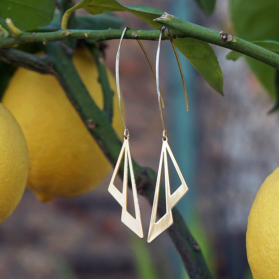 Handmade earrings | Super lightweight, exquisite, light-reflecting gold-plated layered triangles on a gold-plated long drop hook, a delicate golden pair perfect for an elegant daytime look or adding pure sophisticated glamour to an evening ensemble.