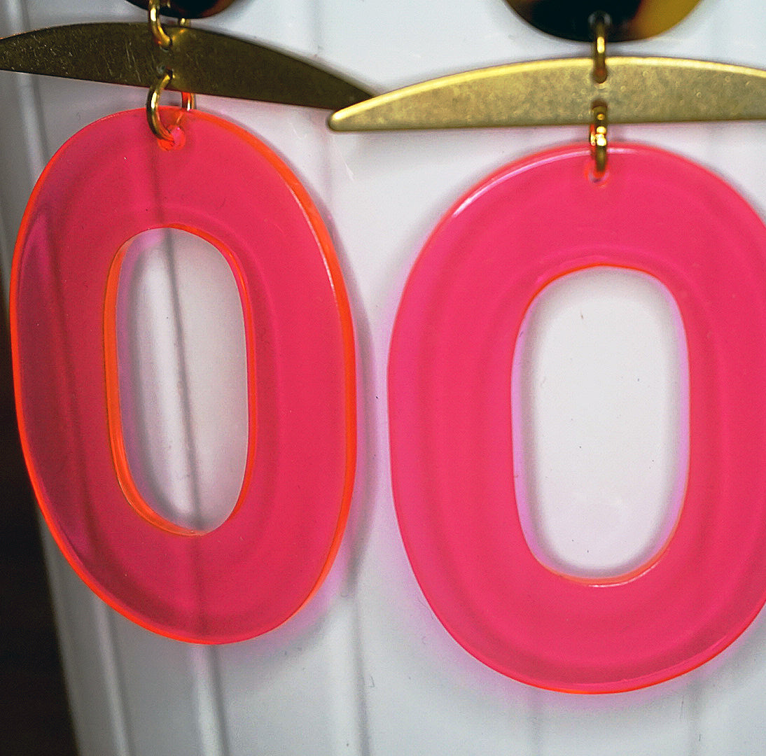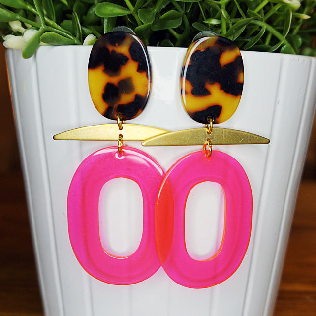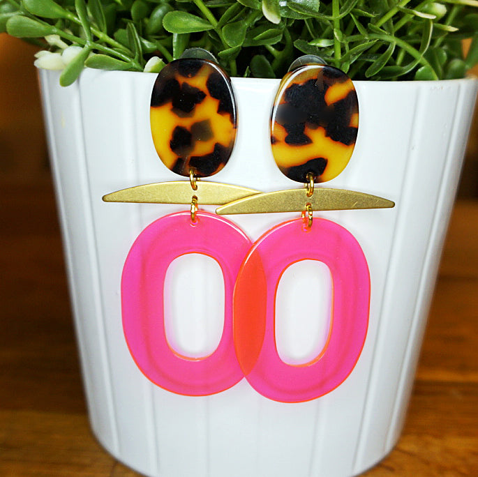 Neon Pink & Tortoiseshell Oval Stud Dangle