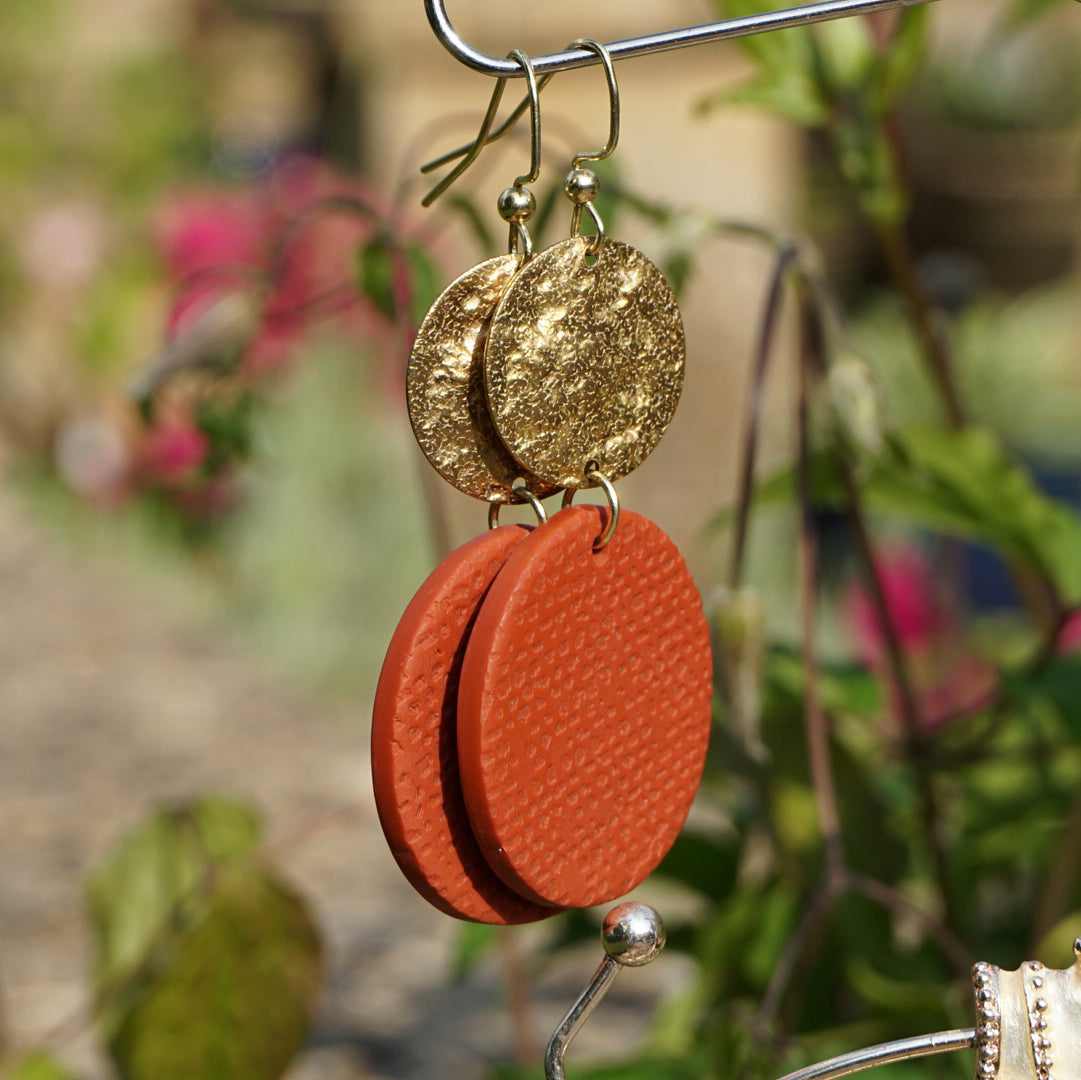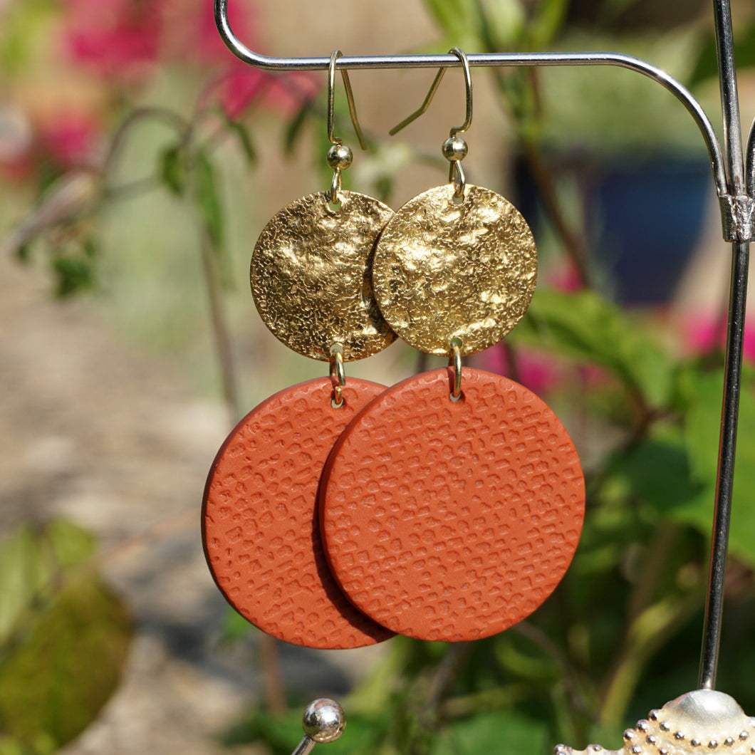 Handmade earrings | A striking pair of Riviera-inspired polymer clay dangles with a glistening hammered brass coin.