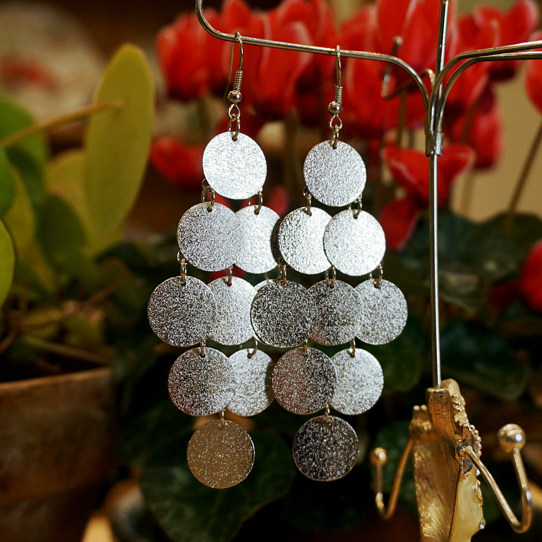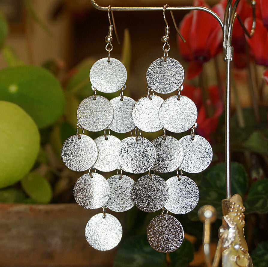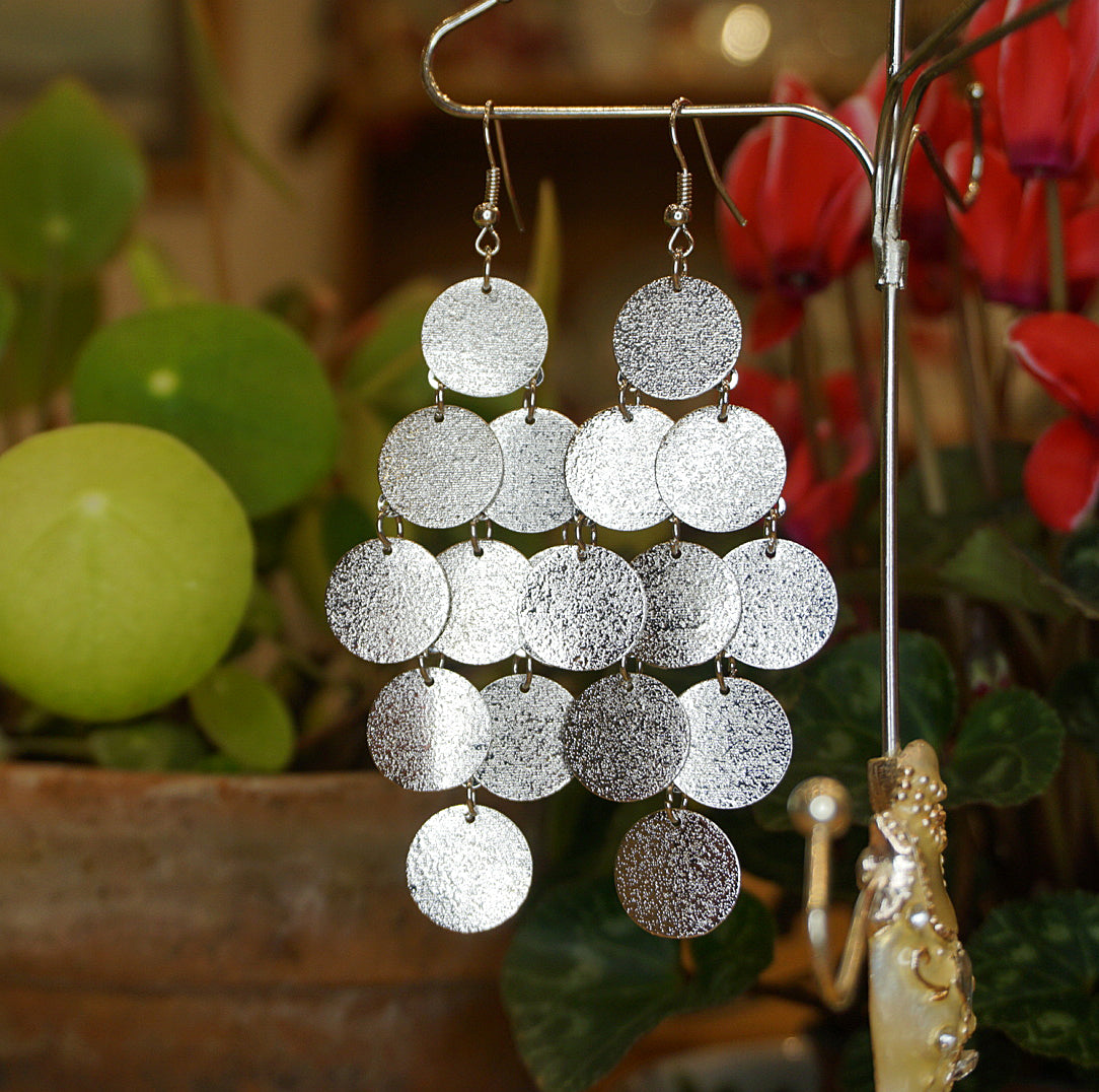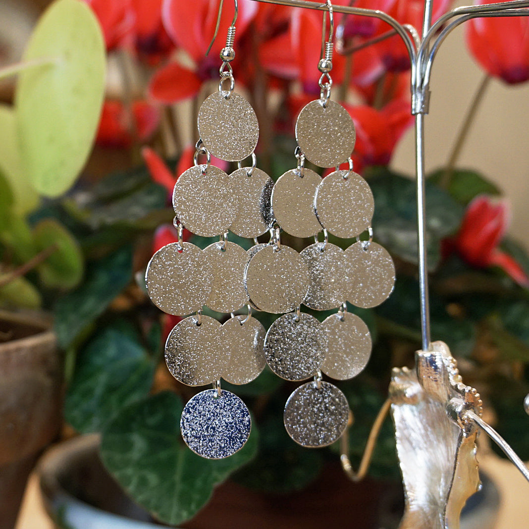 Handmade earrings | Super lightweight reflective chandelier drop earrings, with pretty silver-coloured discs that glisten in the sunlight. Perfect for summertime glamour and the sparkly winter party season.