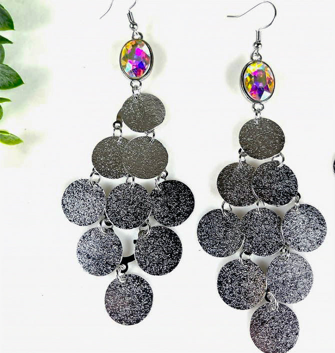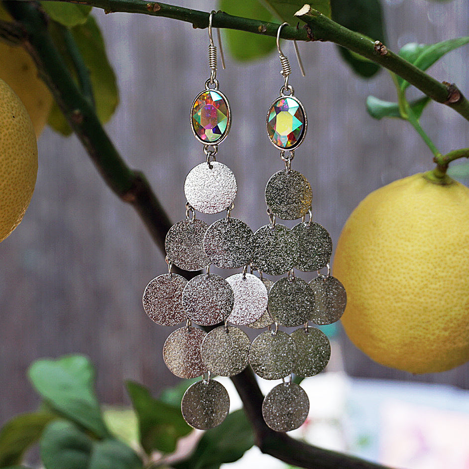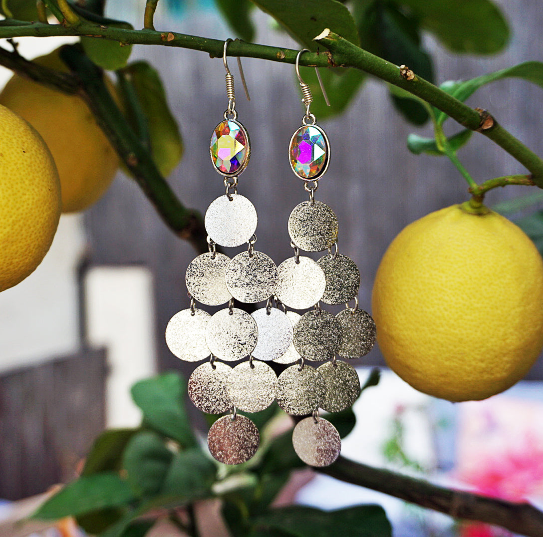 Handmade earrings | Super lightweight reflective chandelier earrings, with pretty silver-coloured discs that glisten in the sunlight. Perfect for adding Barcelona-style chic to any outfit - as a boho accessory during the daytime, or as pure elegance in the evening through to night.