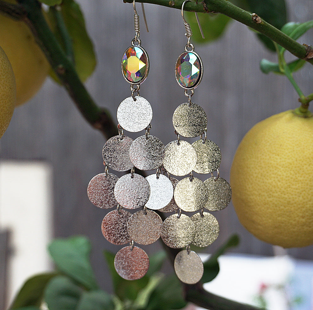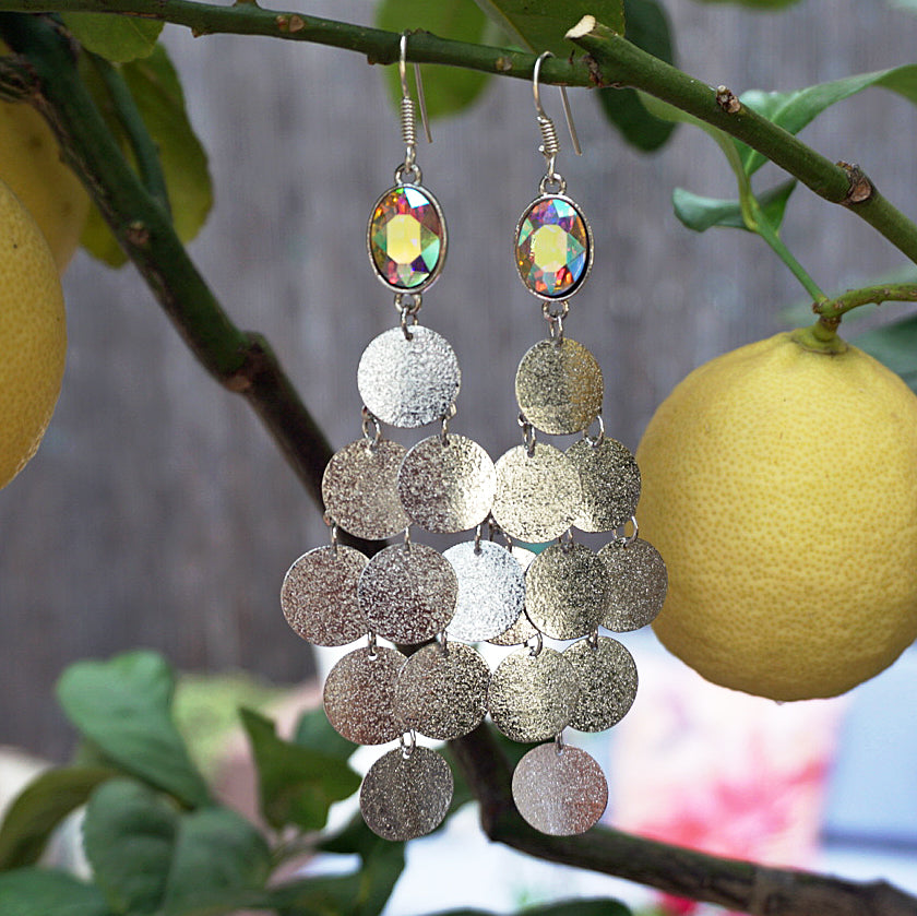 Handmade earrings | Super lightweight reflective chandelier earrings, with pretty silver-coloured discs that glisten in the sunlight. Perfect for adding Barcelona-style chic to any outfit - as a boho accessory during the daytime, or as pure elegance in the evening through to night.