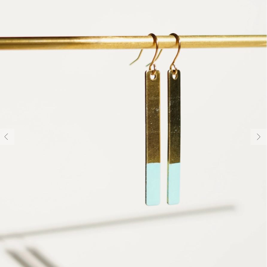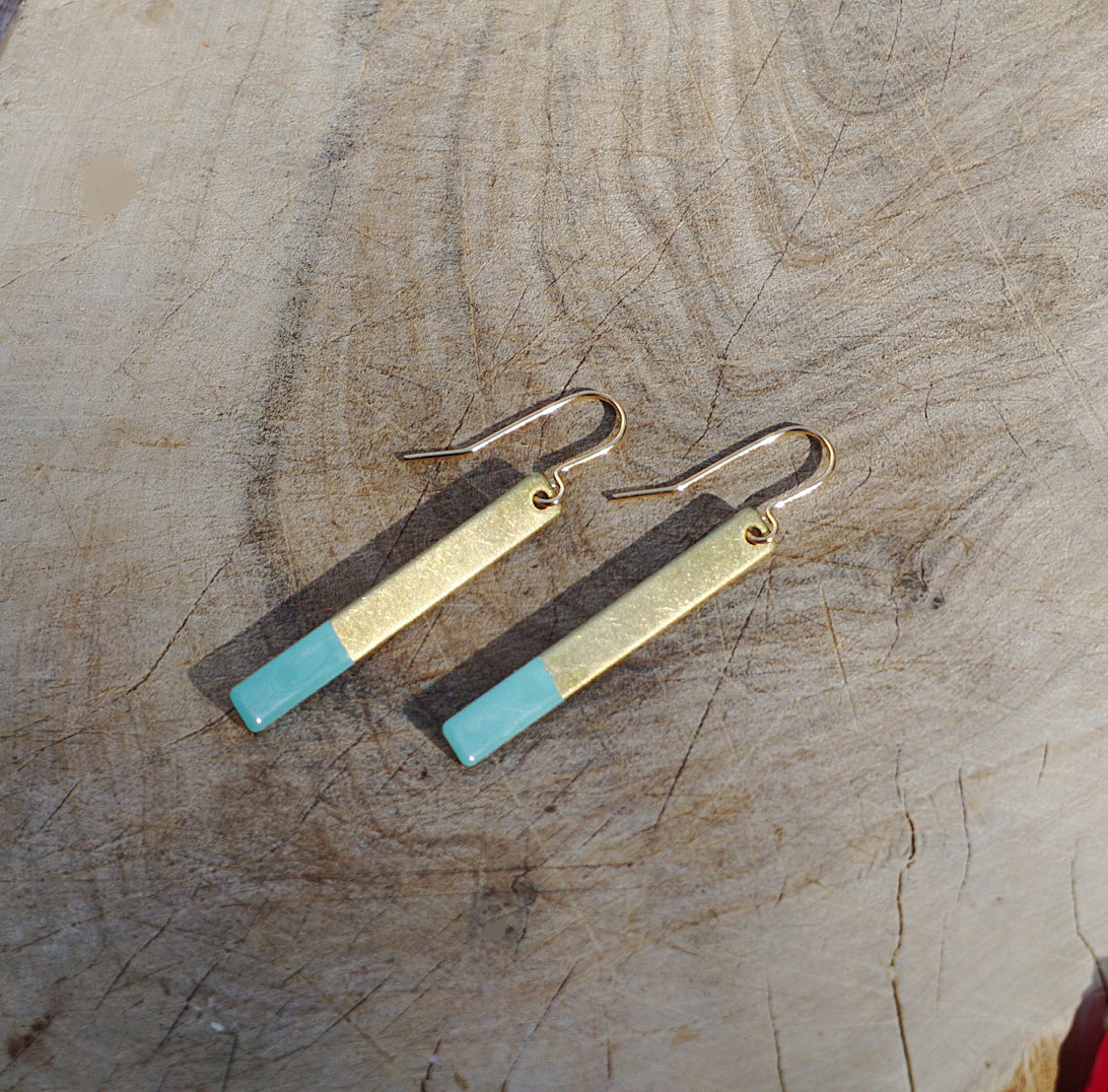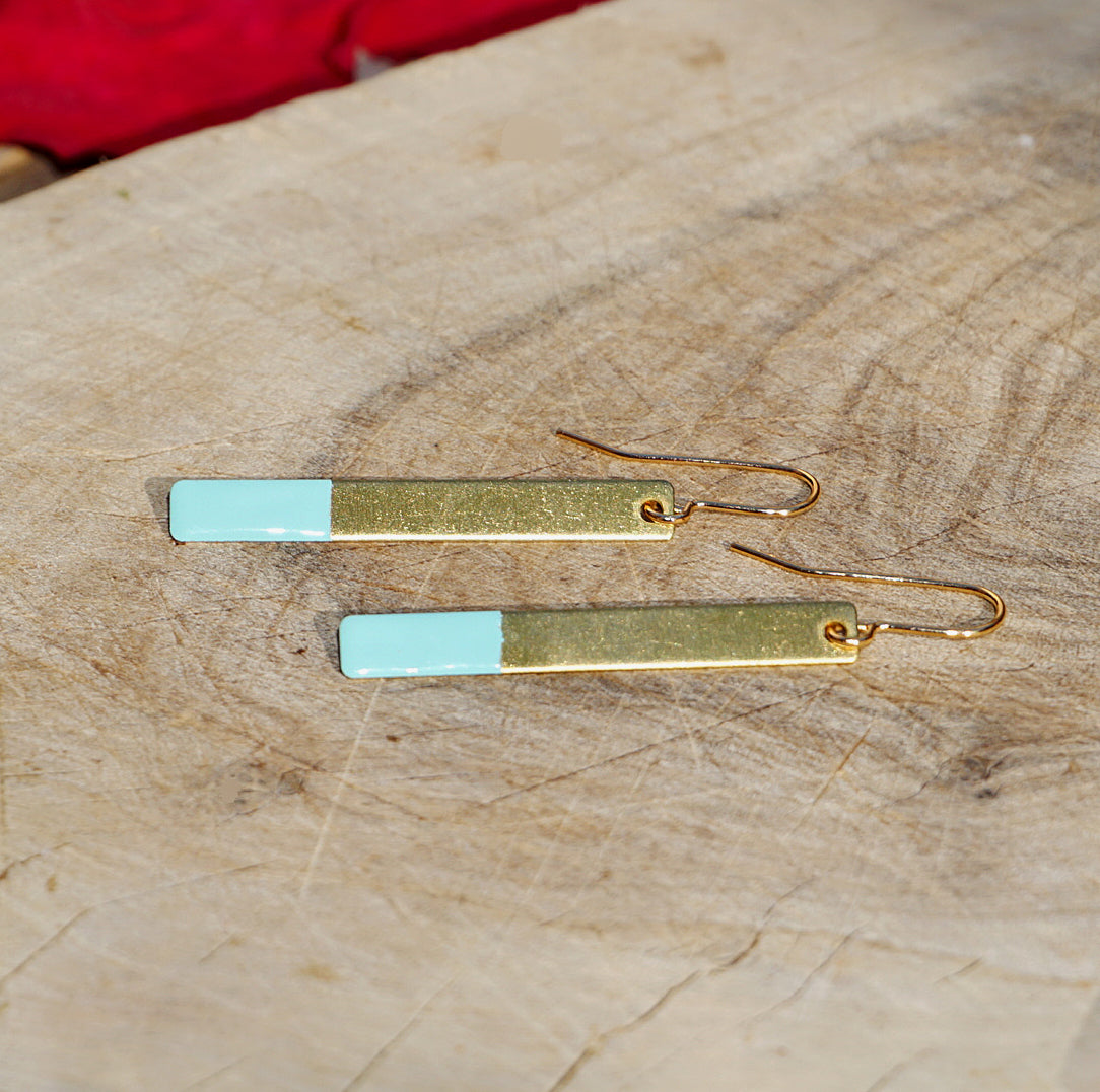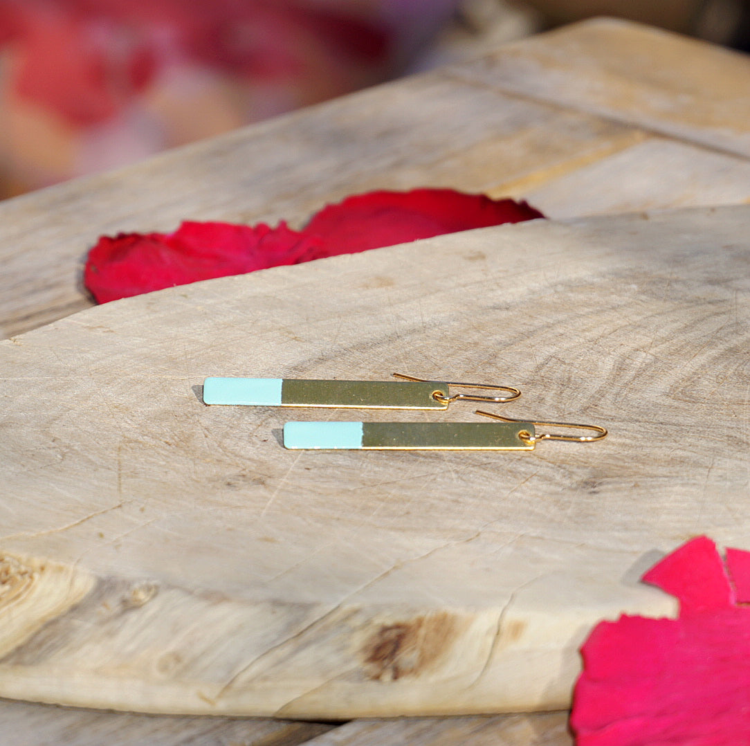 Handmade earrings | A dainty brass rectangle bar hand-enamelled with a light turquoise colour dangles from a gold-plated hook, exuding the colours of the Mediterranean.