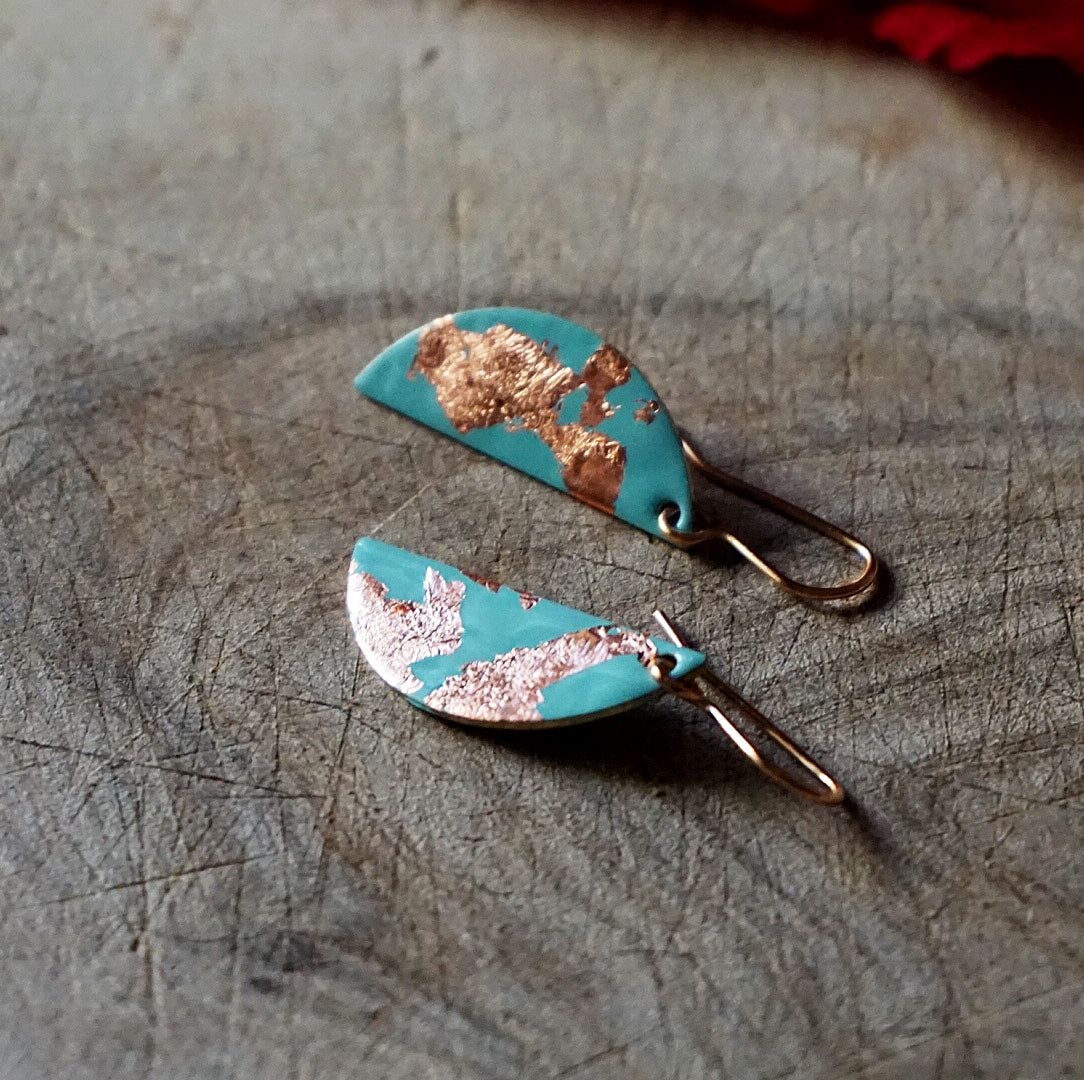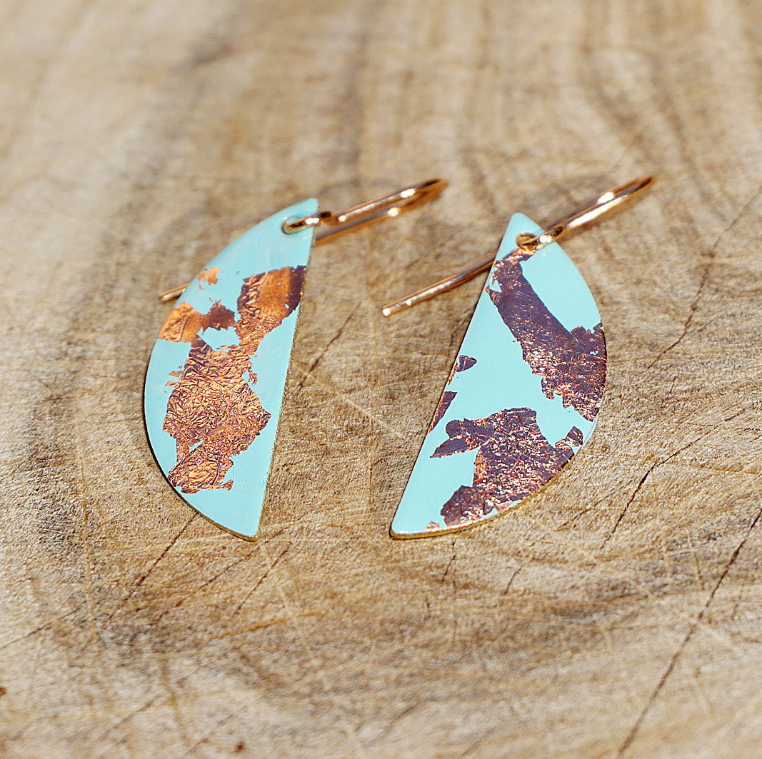 Handmade earrings | Lightweight hand-enamelled drop earrings. The brass semi-circles are enamelled with a light turquoise colour before delicate copper leaf is used to embellish each pair.