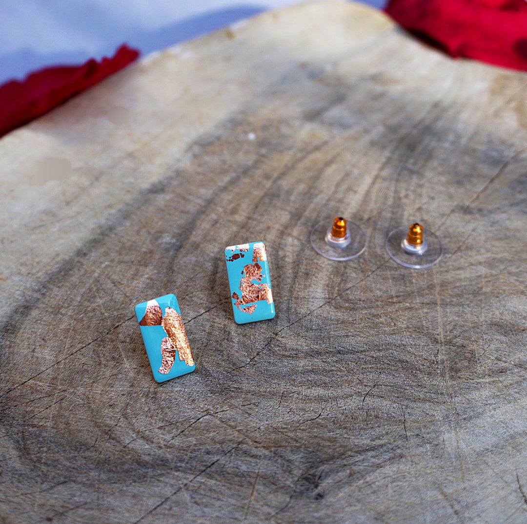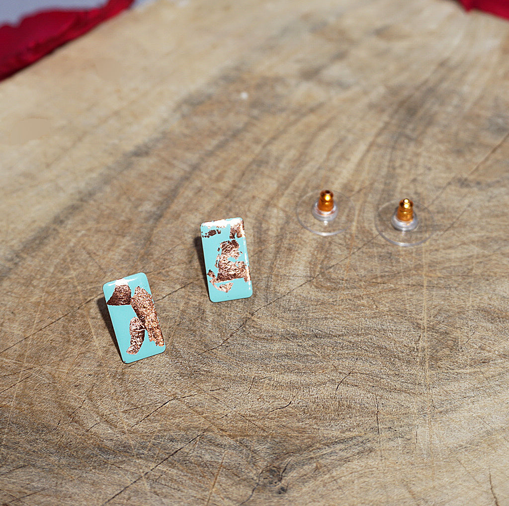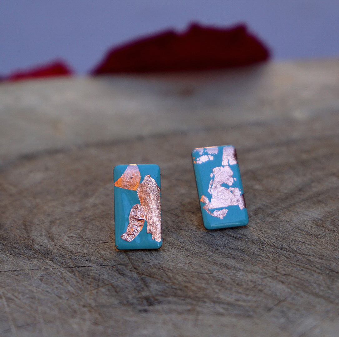 Handmade earrings | A stunning pair of hand-enamelled stud earrings. Small brass rectangles are hand-enamelled with a light turquoise colour before delicate copper leaf is used to embellish each pair.